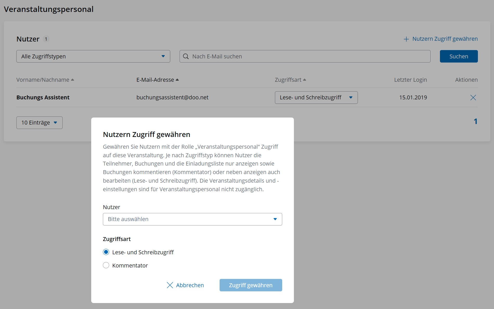 Für jede einzelne Person Ihres Veranstaltungspersonals können Sie pro Veranstaltung zwischen zwei Zugriffsarten wählen: